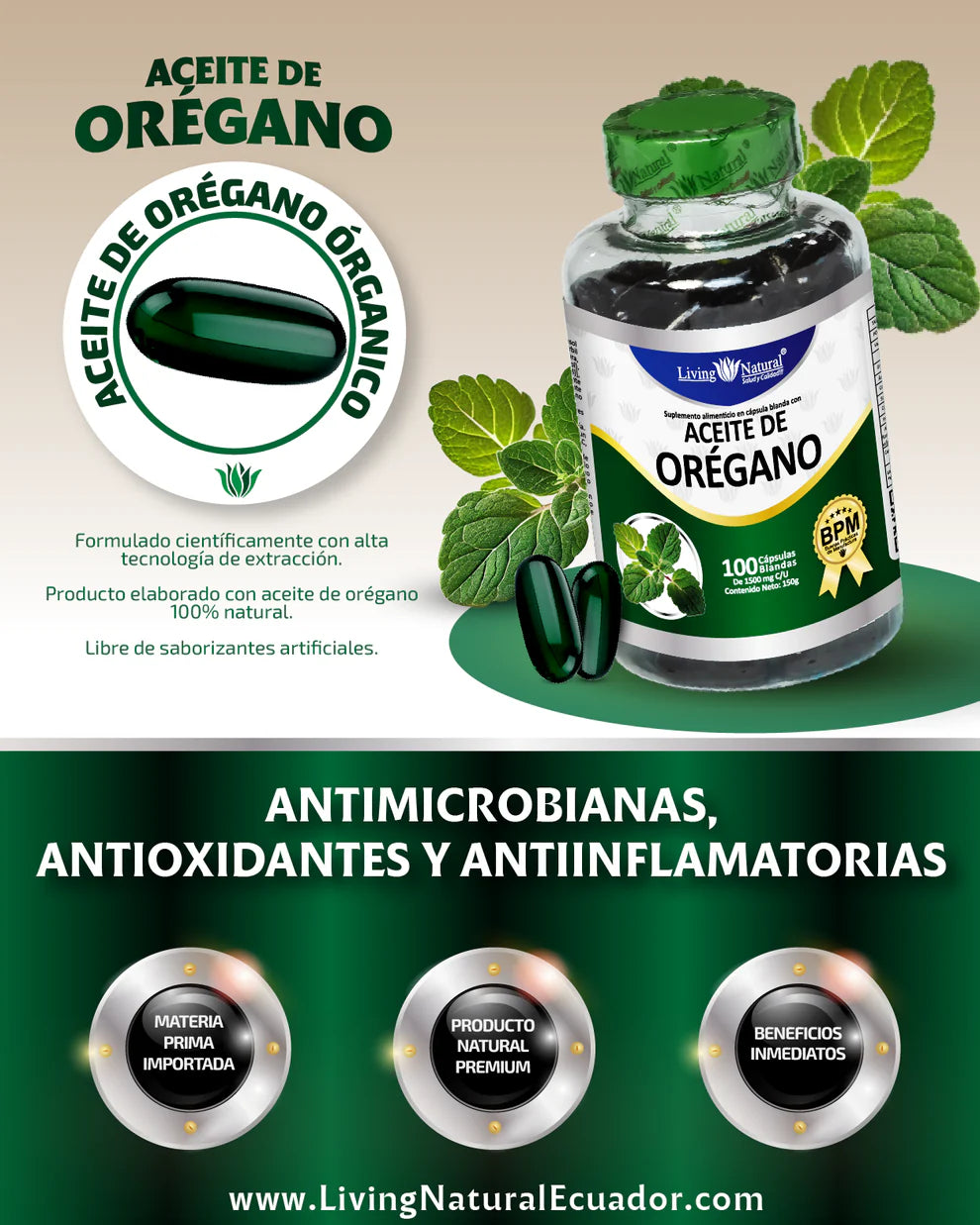 El aceite de orégano contiene compuestos con propiedades antimicrobianas, antiinflamatorias y antioxidantes que ayudan a mejorar la salud general, fortalecer el sistema inmunológico y mantener el equilibrio intestinal.